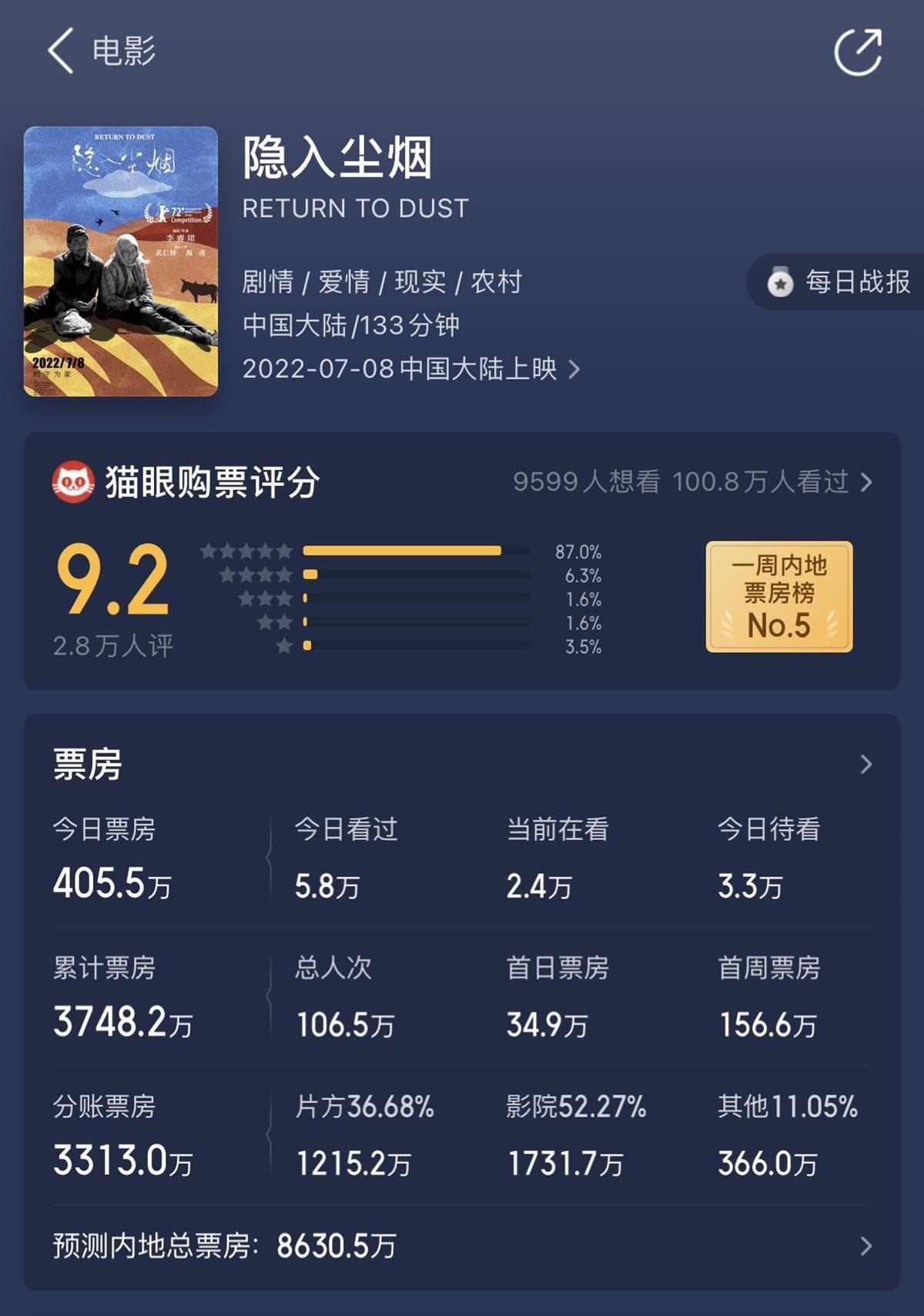 電影《隱入塵煙》于7月8日上映后,收獲爆棚口碑的同時卻失意票房,引來無數網友為其叫屈,“這不是‘年度最佳’該有的待遇。”好在,好電影自帶生命力。8月30日,在上映54天后,《隱入塵煙》單日票房達到400萬,是其上映首日票房的10余倍。
