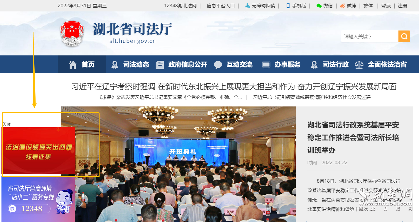 荊楚網(湖北日報網)訊 (記者肖慧婷 實習生樊佳琦)9月1日,湖北省司法廳法治建設領域突出問題線索網上征集系統(https://sft.hubei.gov.cn/fzlm/yjzj/xszj/index.shtml)正式上線,人民群眾可通過省司法廳官網及公眾號、荊楚網法治頻道、湖北法治網、湖北法律服務網等平臺登錄訪問,反映我省法治建設存在的問題。