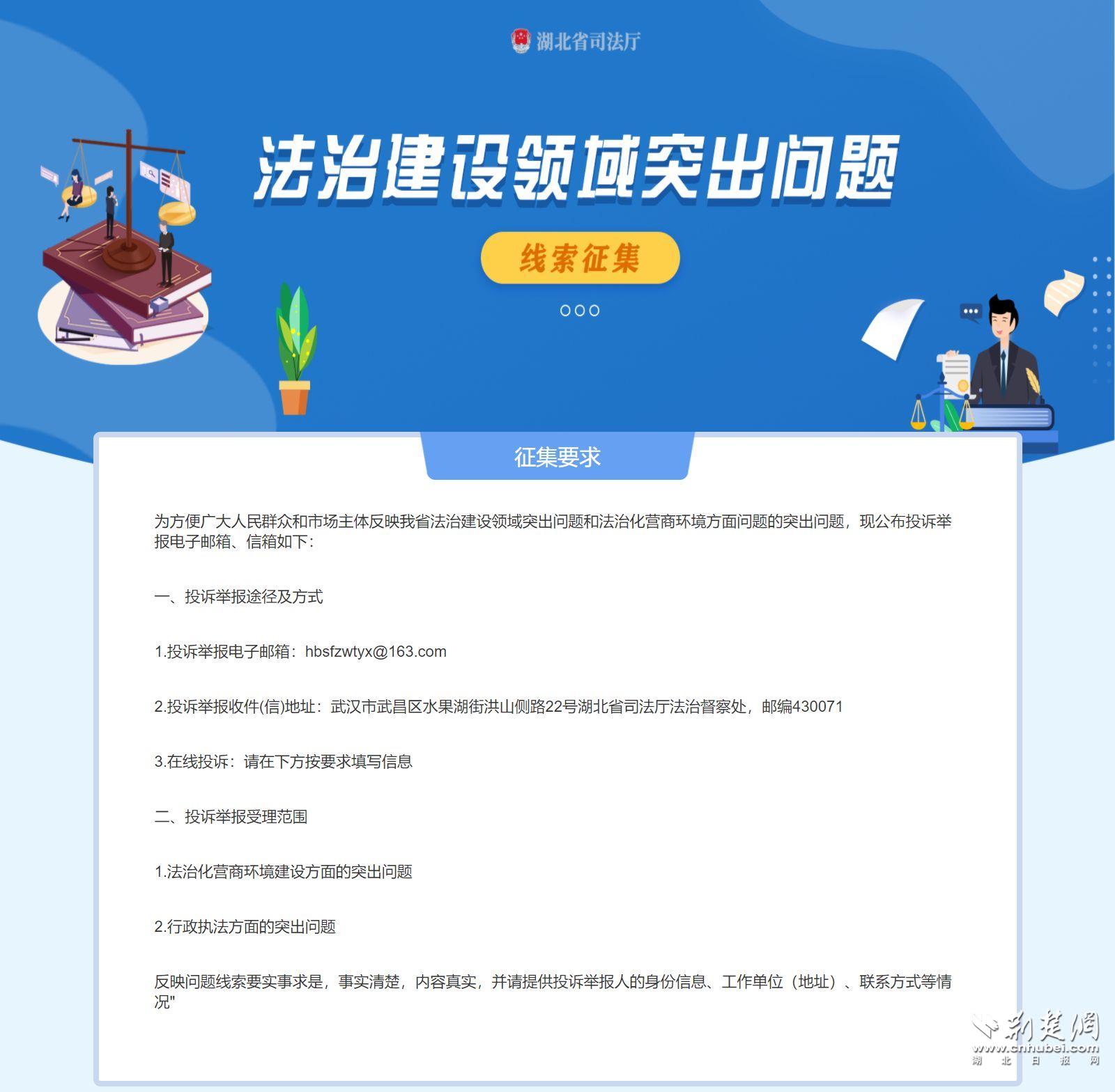 今年3月,省司法廳發布公告,通過信箱和電子郵件,面向社會廣泛征集法治化營商環境建設、行政執法兩個方面的突出問題。為拓寬問題線索反饋渠道、提高信息收集辦理效率,省司法廳在前期工作的基礎上,升級上線問題線索網上征集系統,為人民群眾參與湖北法治建設提供更加便捷的表達途徑。