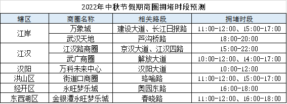 今年中秋節假期與教師節重疊,市內部分大型商場將會舉辦較大的節日促銷活動,且第二輪“惠購湖北”消費券已于9月6日晚發放,預計假期中消費人群將有所增加,商圈周邊道路擁堵頻發(因前往商場車流較為聚集,預計部分商場進出口通道附近出現多次短時排隊現象)。