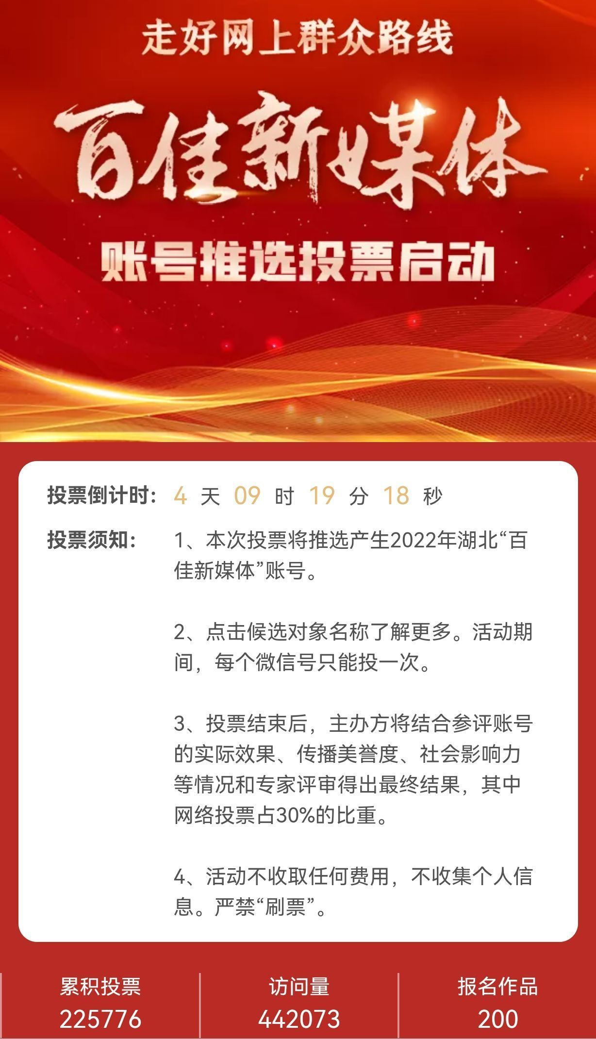 9月13日,2022年湖北走好網(wǎng)上群眾路線“百佳新媒體賬號”推選活動(dòng)開啟網(wǎng)絡(luò)投票,參選賬號紛紛推文吸引網(wǎng)友投票。截至9月15日14時(shí),網(wǎng)友投票數(shù)達(dá)22.5萬,訪問量超44.2萬。