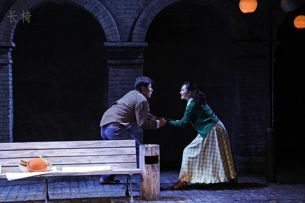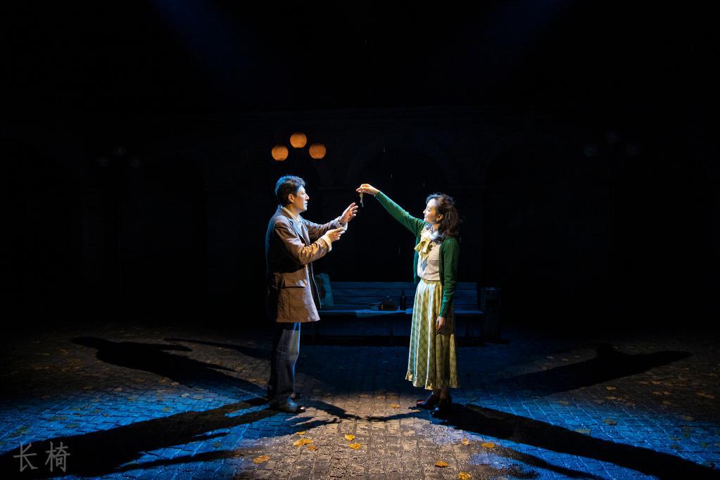 前蘇聯劇作家蓋利曼的《長椅》是一部只有兩個人的話劇,于震、辛月分飾的男女主人公在路邊一把長椅上,帶著各自過往經歷開始彼此試探,時而慢慢靠近時而又反目離去……明暗的路燈、縈繞的霧氣、落下的雨滴、突現的氣球,讓舞臺充滿真實又虛幻的氛圍。