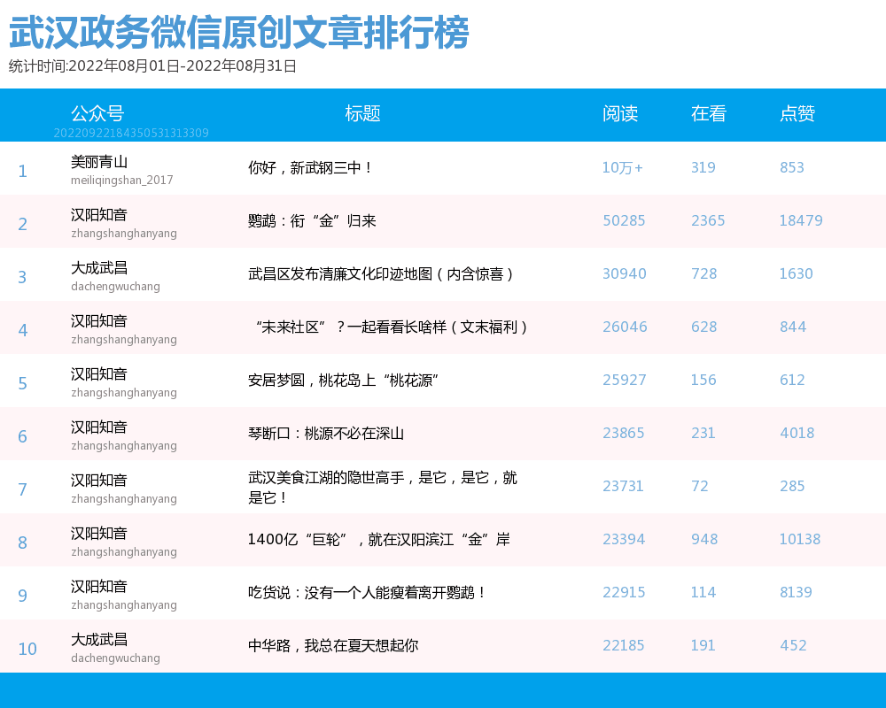 在8月武漢城區(qū)政務微信的原創(chuàng)文章閱讀量前十榜單中,“漢陽知音”占據(jù)大部分席位,攜7篇原創(chuàng)文章入榜。“美麗青山”入圍1篇,“大成武昌”入圍2篇。