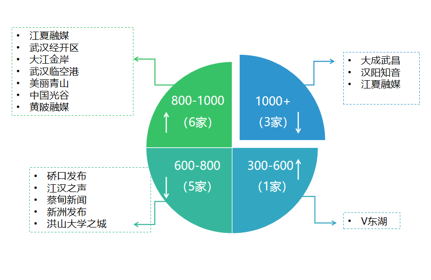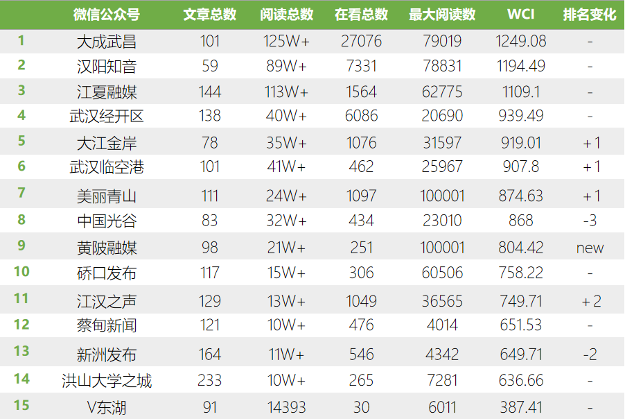 “大成武昌”在閱讀總數(shù)、在看總數(shù)和頭條文章閱讀量的絕對優(yōu)勢,助力其穩(wěn)居榜首。“漢陽知音”8月發(fā)布的文章總數(shù)在前十五名賬號中最少,但在平均閱讀數(shù)、點贊總數(shù)、最大點贊數(shù)等維度上均為榜單第一,體現(xiàn)出其在打造精品文章方面獨具匠心,使得其排名穩(wěn)居榜單前二位。“江夏融媒”發(fā)布文章次數(shù)和頭條文章閱讀量均排名第一,閱讀總數(shù)排名第二。“大江金岸”“武漢臨空港”“美麗青山”排名均上升一位,“江漢之聲”排名上升兩位。此外,“中國光谷”下降3個名次,“新洲發(fā)布”下降2個名次。值得肯定的是,本期“黃陂融媒”誕生10萬+文章,助推WCI指數(shù)穩(wěn)步上揚,成功挺進前十五名榜單。