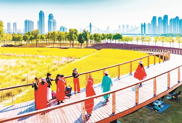 東起晴川橋,西至長豐橋,綿延15公里的漢江江灘,從曾經的雜亂險灘變身為最美岸線。