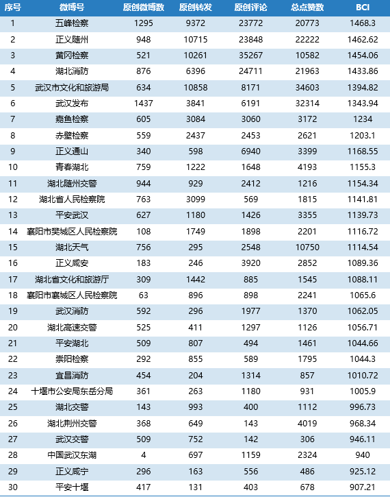 1、聚集湖北省內主要黨政機關政務微博號,根據BCI指數數據進行科學排行,主要從“整體傳播力”、“篇均傳播力”、“頭條傳播力”、“峰值傳播力”四個維度進行評價。
