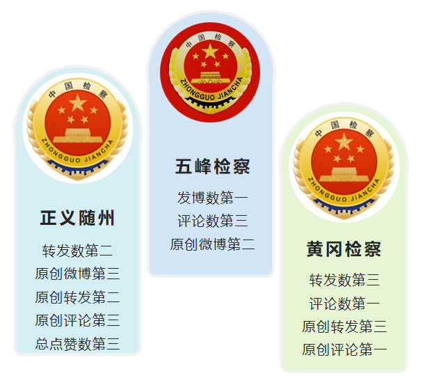 10月21日,由荊楚網(湖北日報網)、楚天輿情數據研究院制作的湖北政務微博2022年9月榜發布。@五峰檢察、@正義隨州、@黃岡檢察 三家單位躋身榜單前三名。其中@五峰檢察 占據榜首,@正義隨州 @黃岡檢察 仍居榜單前三。