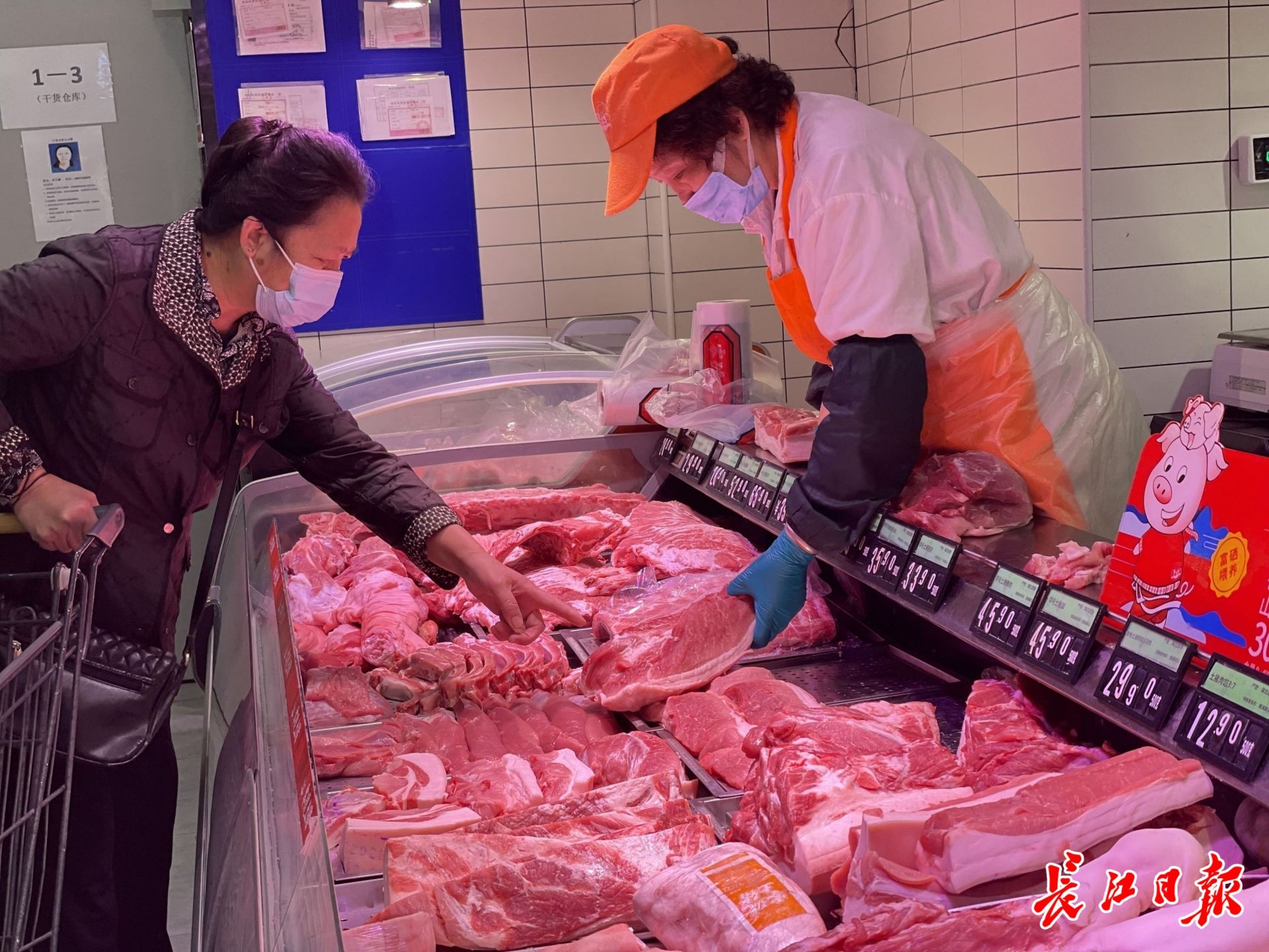 超市的肉品區里,土豬、黑豬、中糧家佳康、萬匯,有四個品類的肉柜,師傅正在將剛出庫的肉,分割成小塊,擺上貨架。家住濱江苑的呂阿姨正在選購土豬肉,她告訴記者,她習慣早上過來買肉,“家里人嘴巴比較刁,要選部位。價格和平常沒什么變化,我在這里買東西十幾年了,他們的各項檢驗都按照國家統一規定進行,比較放心”。呂阿姨說,她只準備購買當日所需肉品,“不想囤貨,沒有了就來買”。