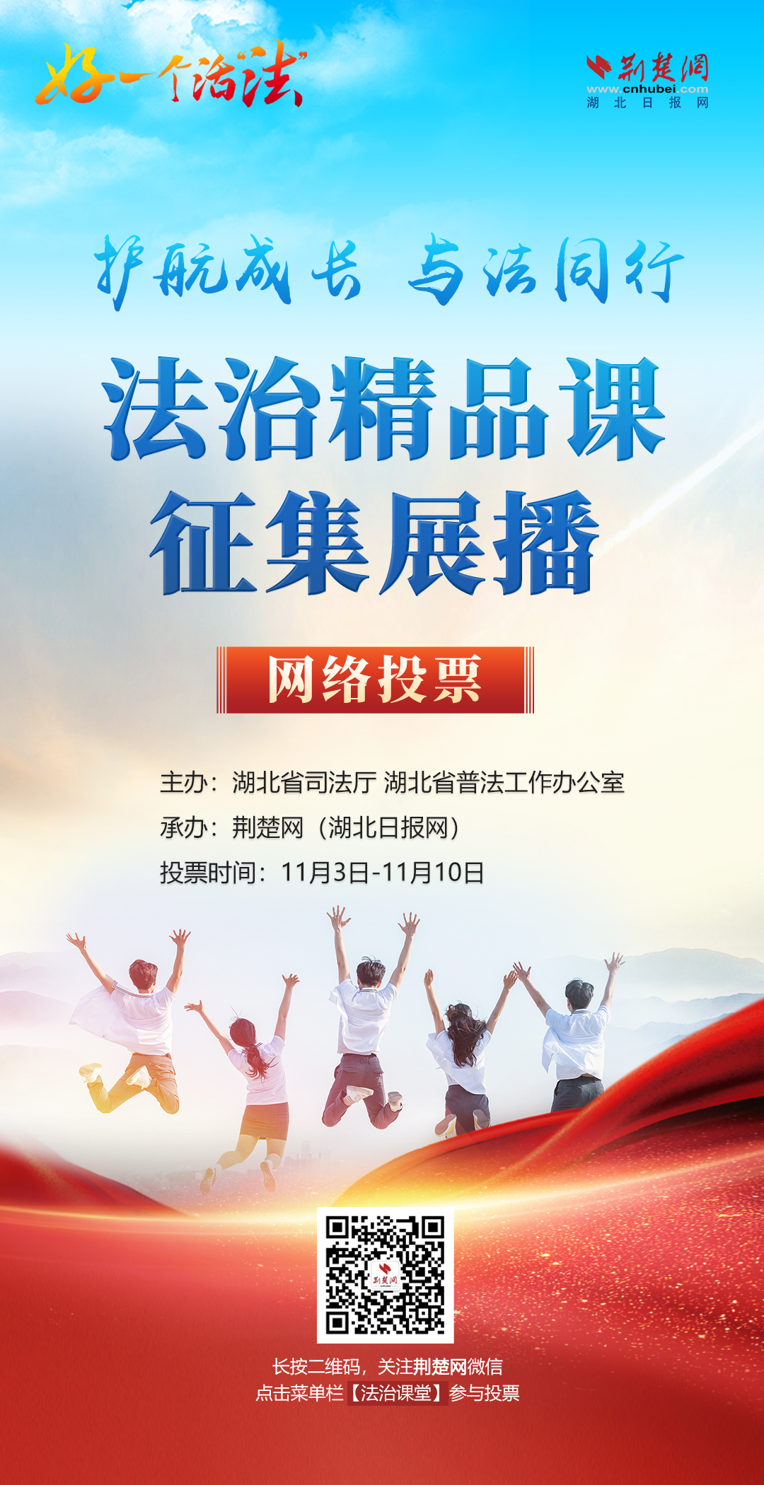 荊楚網(湖北日報網)訊(記者邱玲鵬 肖慧婷 實習生樊佳琦)法治精品課,護航少年的你。11月3日,由湖北省司法廳、湖北省普法工作辦公室主辦,荊楚網(湖北日報網)承辦的“護航成長 與法同行”法治精品課征集展播活動正式開啟網絡投票。