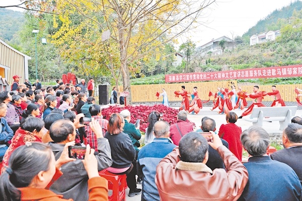 11月3日,在保康縣歇馬鎮鄒家院村文化小廣場,文藝志愿者為村民表演文藝節目。