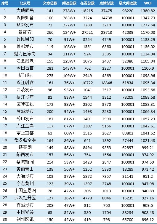 從WCI數(shù)據(jù)來看,本期榜單整體數(shù)據(jù)都有所提升,入榜前30名的區(qū)縣政務(wù)微信賬號中,WCI指數(shù)破千的賬號數(shù)量上升為19個,分別為“大成武昌”“漢陽知音”“硒都發(fā)布”“最紅安”“雄風(fēng)當(dāng)陽”“曾都發(fā)布”“魅力伍家崗”“江夏融媒”“今日石首”和“新江陵”“漢江創(chuàng)客”“西陵發(fā)布”“枝江發(fā)布”“孱陵在線”“麻城發(fā)布”“硚口發(fā)布”“大江金岸”“掌上宜都”“武漢臨空港”。本期前30名賬號的WCI指數(shù)均在890以上。
