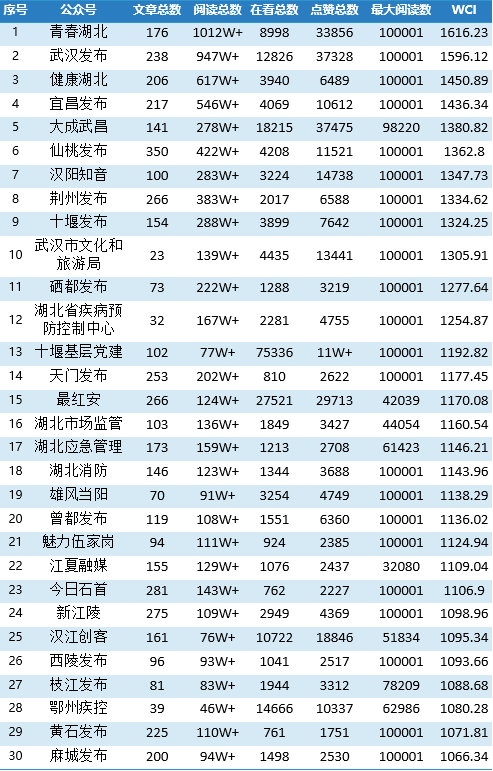 從排名看,本期16個(gè)賬號(hào)排名上升。其中,新晉賬號(hào)有9個(gè),分別為“仙桃發(fā)布”“曾都發(fā)布”“魅力伍家崗”“今日石首”“新江陵”“西陵發(fā)布”“枝江發(fā)布”“鄂州疾控”“麻城發(fā)布”。“青春湖北”“武漢發(fā)布”“健康湖北”“宜昌發(fā)布”等4個(gè)賬號(hào)排名穩(wěn)居前列。