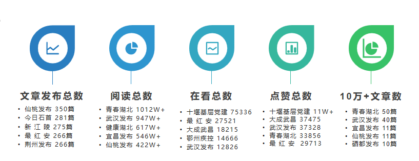 從單項(xiàng)指數(shù)看,閱讀總數(shù)、頭條文章閱讀量、10W+文章等指數(shù)普遍有所上漲。比如閱讀總數(shù),27個(gè)賬號(hào)出現(xiàn)上漲。其中,“仙桃發(fā)布”閱讀總數(shù)增量高達(dá)376+,位列首位;“荊州發(fā)布”“武漢發(fā)布”“宜昌發(fā)布”閱讀總數(shù)增量均超200W+,分列其后。從頭條文章閱讀量看,26個(gè)賬號(hào)較上期有所增長(zhǎng)。文章方面,10W+文章共有176篇,較上期增加40余篇;“青春湖北”仍是內(nèi)容生產(chǎn)大戶,共產(chǎn)出50篇。
