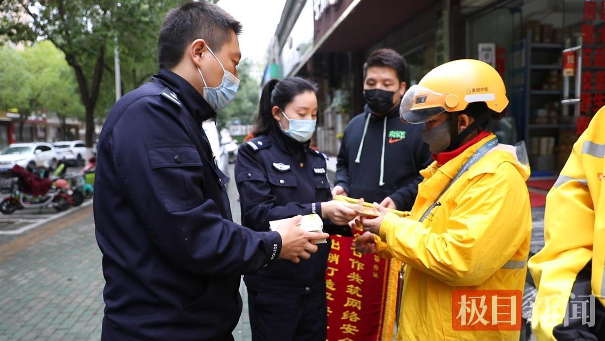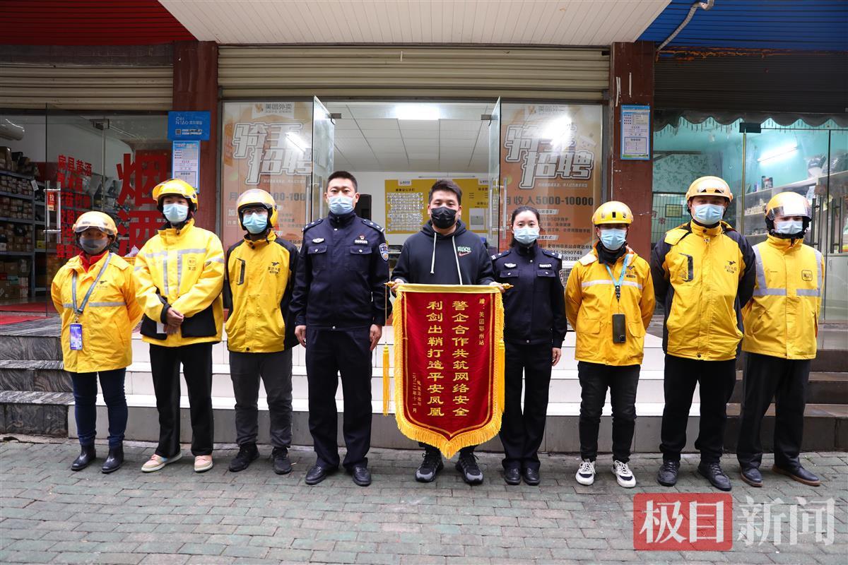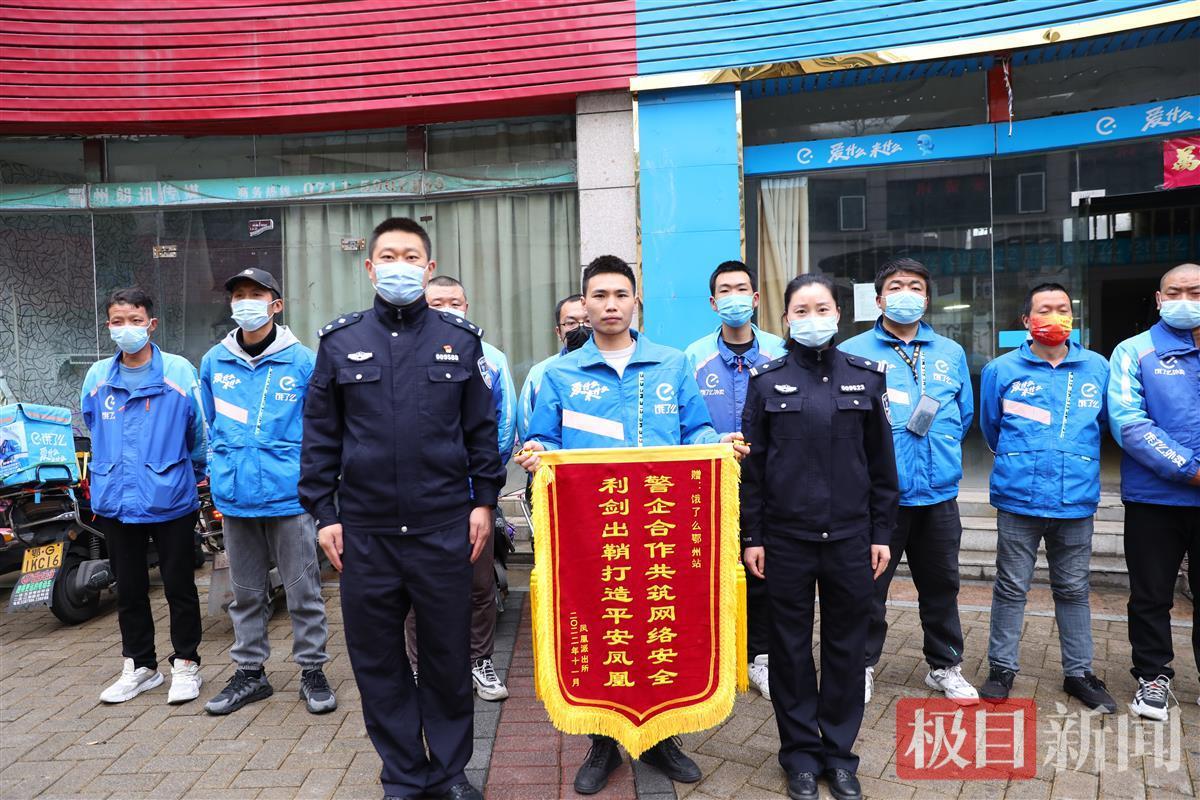 21日,鄂州市公安局鳳凰派出所民警來到“餓了嗎”、“美團”外賣配送站點,為兩家外賣企業送上印有“利劍出鞘打造平安鳳凰 警企合作共筑網絡安全”的錦旗,感謝外賣騎手為反詐宣傳作出的貢獻。