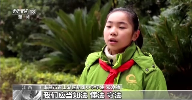 南昌市青山湖區胡家小學學生 鄧漳馳:作為一名少先隊員,我們應當知法、懂法、守法,遵紀守法應該從小做起,從小事做起。我也會把我今天學習到的法律知識告訴給更多的人,讓大家一起知法、懂法、守法。