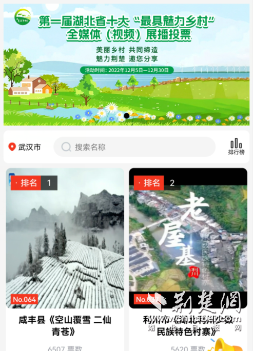 荊楚網(湖北日報網)訊(記者張揚 通訊員彭楚南)12月8日,記者從湖北省文學藝術界聯合會獲悉,第一屆湖北省十大“最具魅力鄉村”全媒體(視頻)大賽展播投票活動全面開啟,102部優秀作品等你來投票。