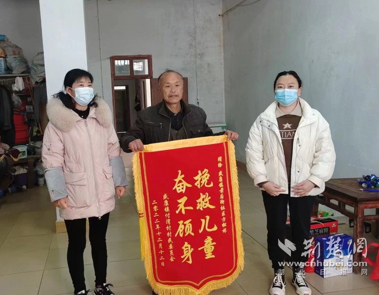 被救孩子家人和村委會共同給退役軍人方松林(中)送來錦旗致謝。通訊員供圖