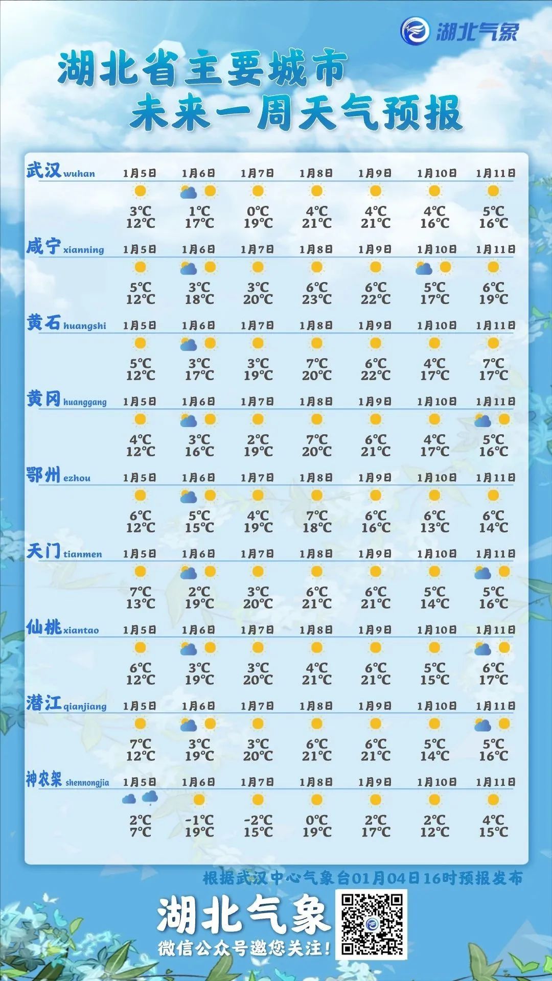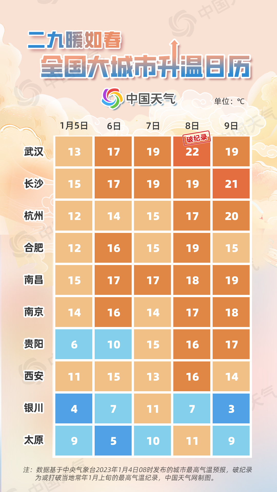 中國天氣網推出的全國大城市升溫日歷顯示,這輪升溫過程中,長江中下游等地是回暖最明顯的區域,多地最高氣溫將突破20℃,暖如初春。武漢8日最高氣溫22°C、長沙9日21°C、杭州9日20°C、合肥8日19°C,都可能接近甚至會打破當地常年1月上旬氣溫最高紀錄。