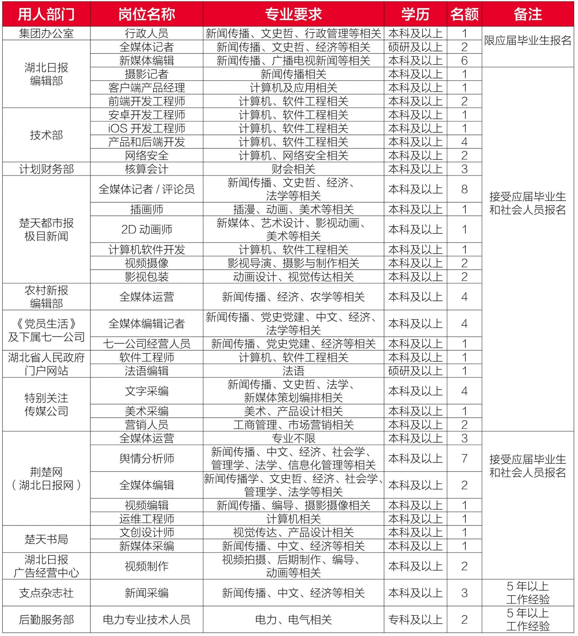 湖北日報傳媒集團是以中共湖北省委機關報《湖北日報》為旗艦的大型綜合性傳媒集團。根據事業發展需要,2023年度擬面向社會公開招聘工作人員80名。現將有關事項公告如下: