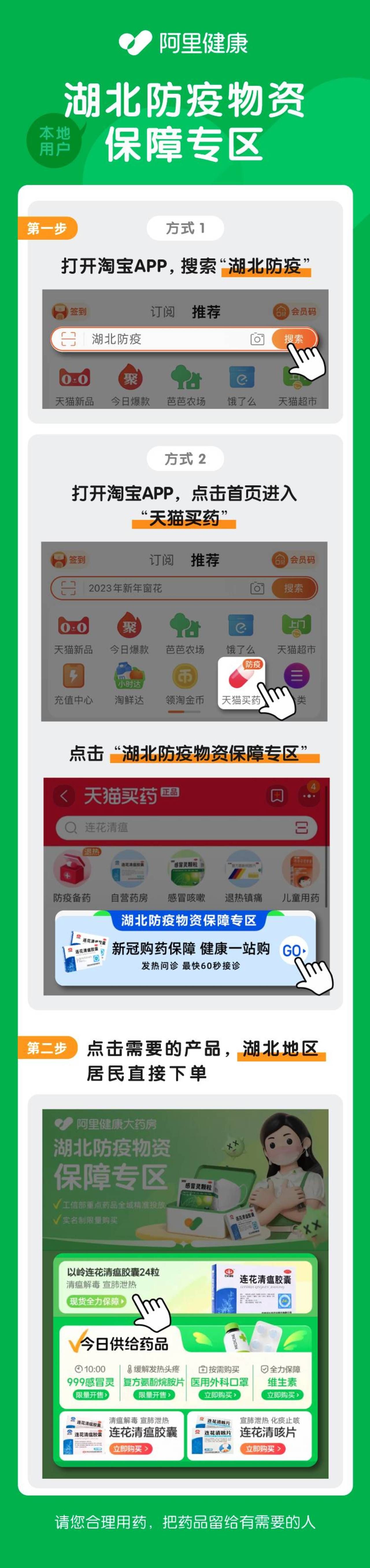為充分發(fā)揮電商平臺在重點防疫藥品保供方面的獨特優(yōu)勢,1月5日,工信部調(diào)度了一批藥品和抗疫物資,通過阿里健康專屬通道支持湖北地區(qū)的重點藥品精準(zhǔn)投放。在湖北省商務(wù)廳和省經(jīng)信廳等有關(guān)部門大力支持下,阿里健康在淘寶平臺設(shè)立了湖北防疫物資保障專區(qū),全力保障湖北地區(qū)居民的購藥需求。湖北地區(qū)居民打開淘寶App搜索“湖北防疫”或進(jìn)入“天貓買藥”,即可直達(dá)“湖北防疫物資保障專區(qū)”,按需購買藥品和防疫物資。