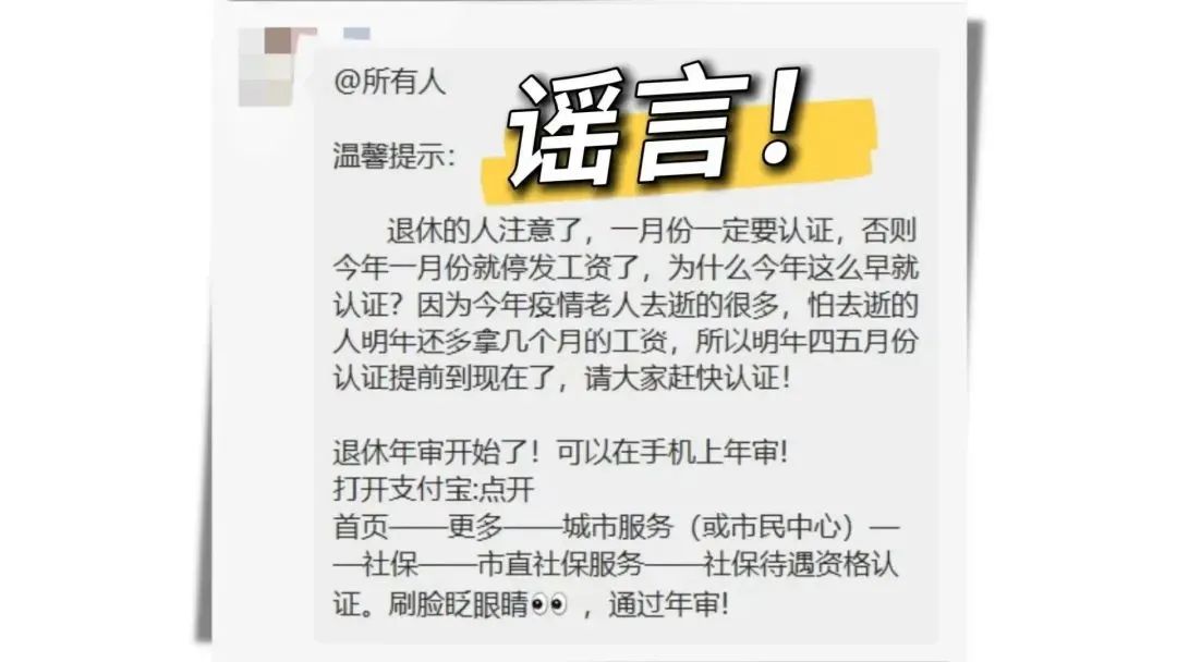 近日,網(wǎng)傳"退休人員必須在今年1月完成待遇資格認(rèn)證,否則將會(huì)停發(fā)待遇等"信息。對(duì)此,1月9日,武漢市人力資源和社會(huì)保障局鄭重聲明:此信息嚴(yán)重失實(shí)?,F(xiàn)就社保待遇資格認(rèn)證(社保年審)的有關(guān)問(wèn)題澄清如下: