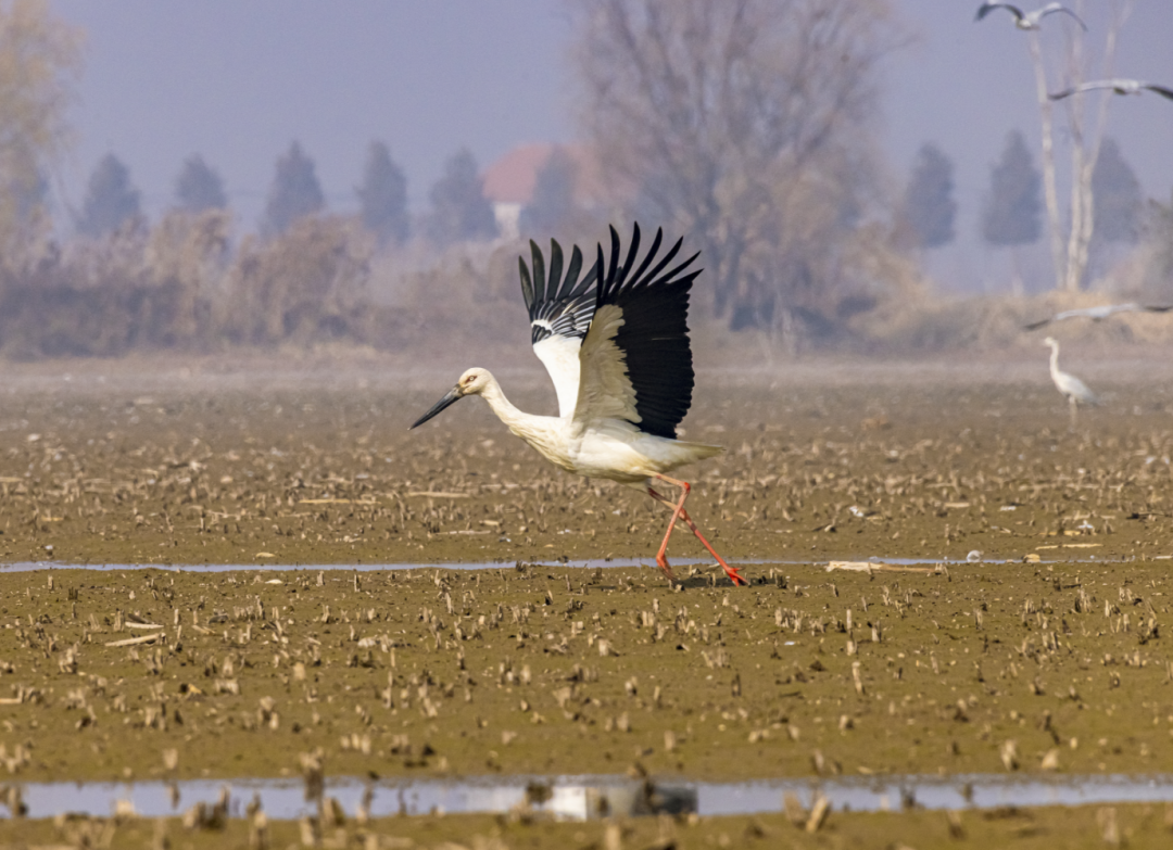 東方白鸛——國家一級重點保護野生動物,大型涉禽,體長110-115厘米。長而粗壯的嘴十分堅硬,呈黑色。身體上的羽毛主要為純白色,與黑色尾部形成強烈對比,翅膀寬而長,覆羽、飛羽為黑色,并具有綠色或紫色的光澤,腿、腳甚長,為鮮紅色。