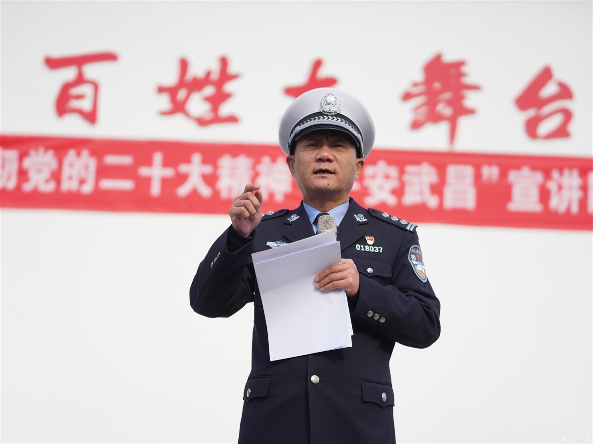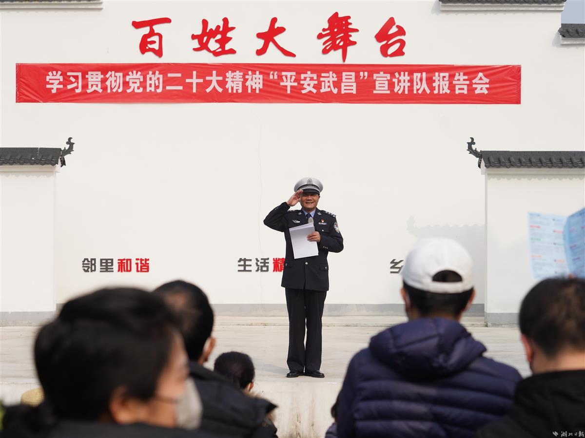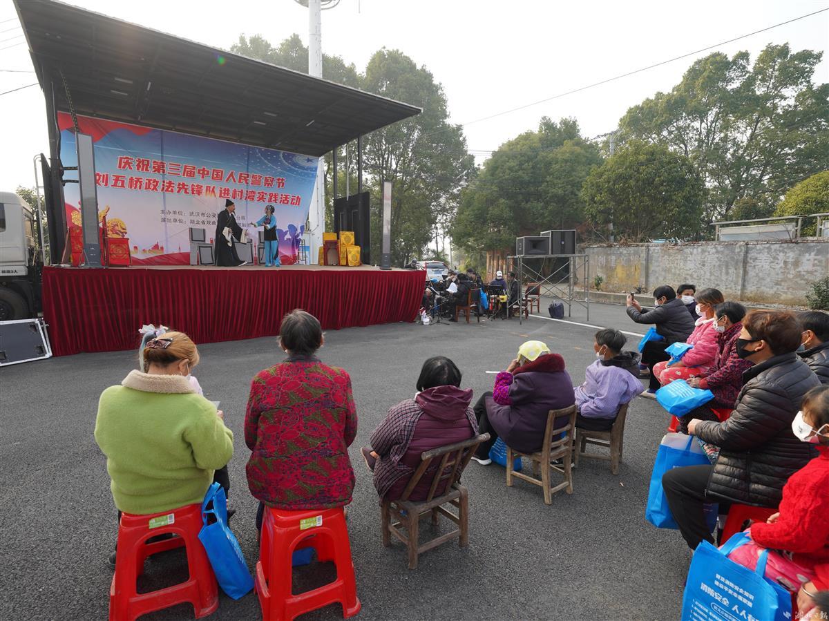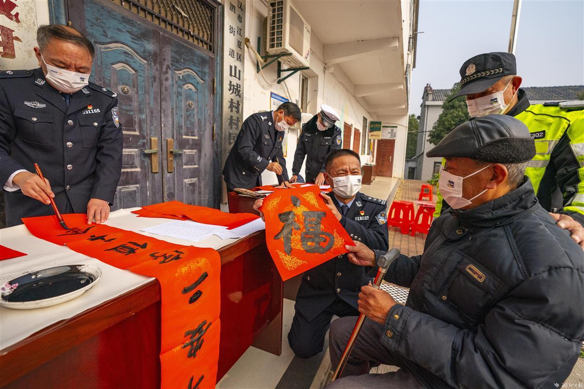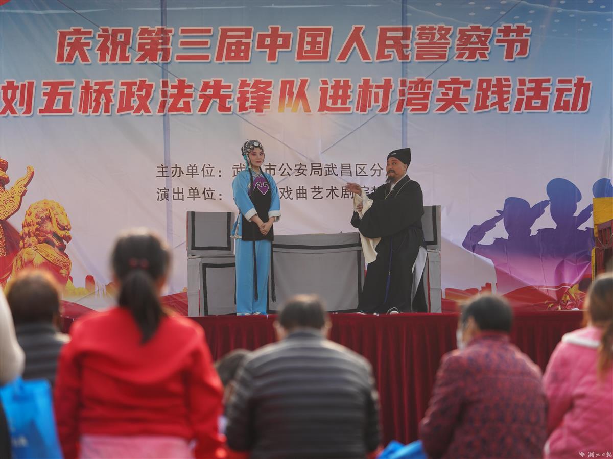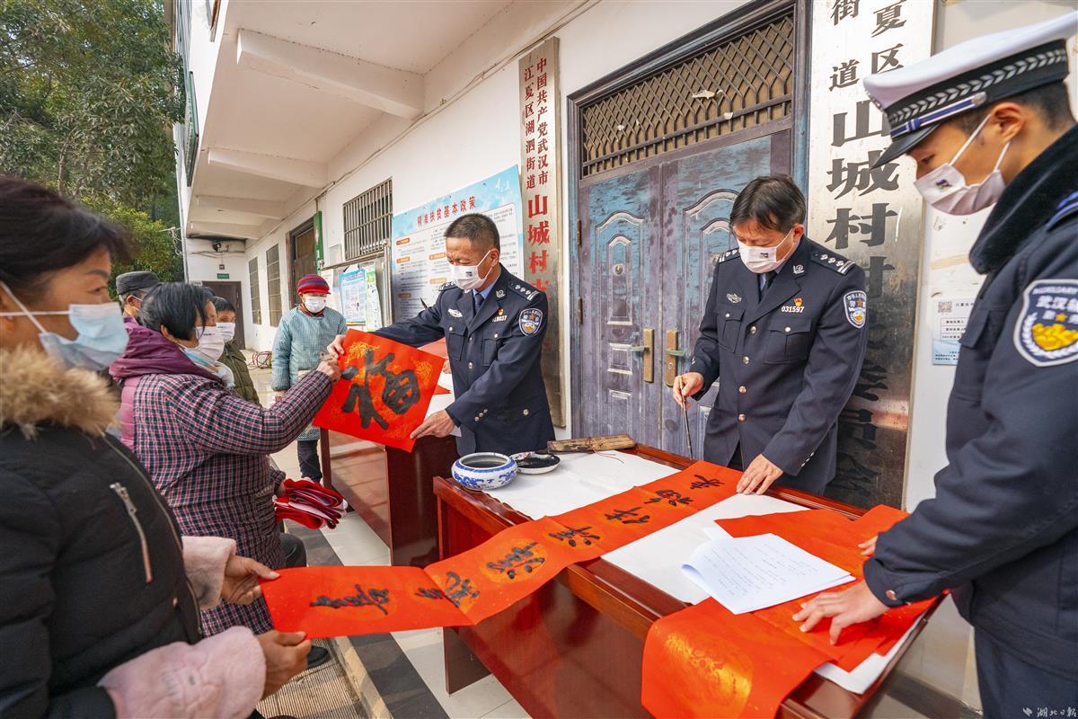 1月10日,武漢市公安局武昌區(qū)分局劉五橋政法先鋒隊(duì)來到江夏區(qū)湖泗街山城村,為村民宣講黨的二十大精神、送春聯(lián)、演楚劇,與村民歡聚一堂、同迎新春。當(dāng)天是第三個(gè)人民警察節(jié),政法先鋒隊(duì)還為村民上了一節(jié)生動(dòng)形象的“反詐防騙”課,幫助大家守護(hù)好自己的“錢袋子”?;顒?dòng)現(xiàn)場(chǎng),警營(yíng)書法家現(xiàn)場(chǎng)給村民書贈(zèng)春聯(lián)。政法先鋒隊(duì)還聯(lián)合湖北省戲曲藝術(shù)劇院的專業(yè)演出隊(duì)伍,將經(jīng)典的楚劇搬到老百姓家門口,豐富村民的文化生活。
