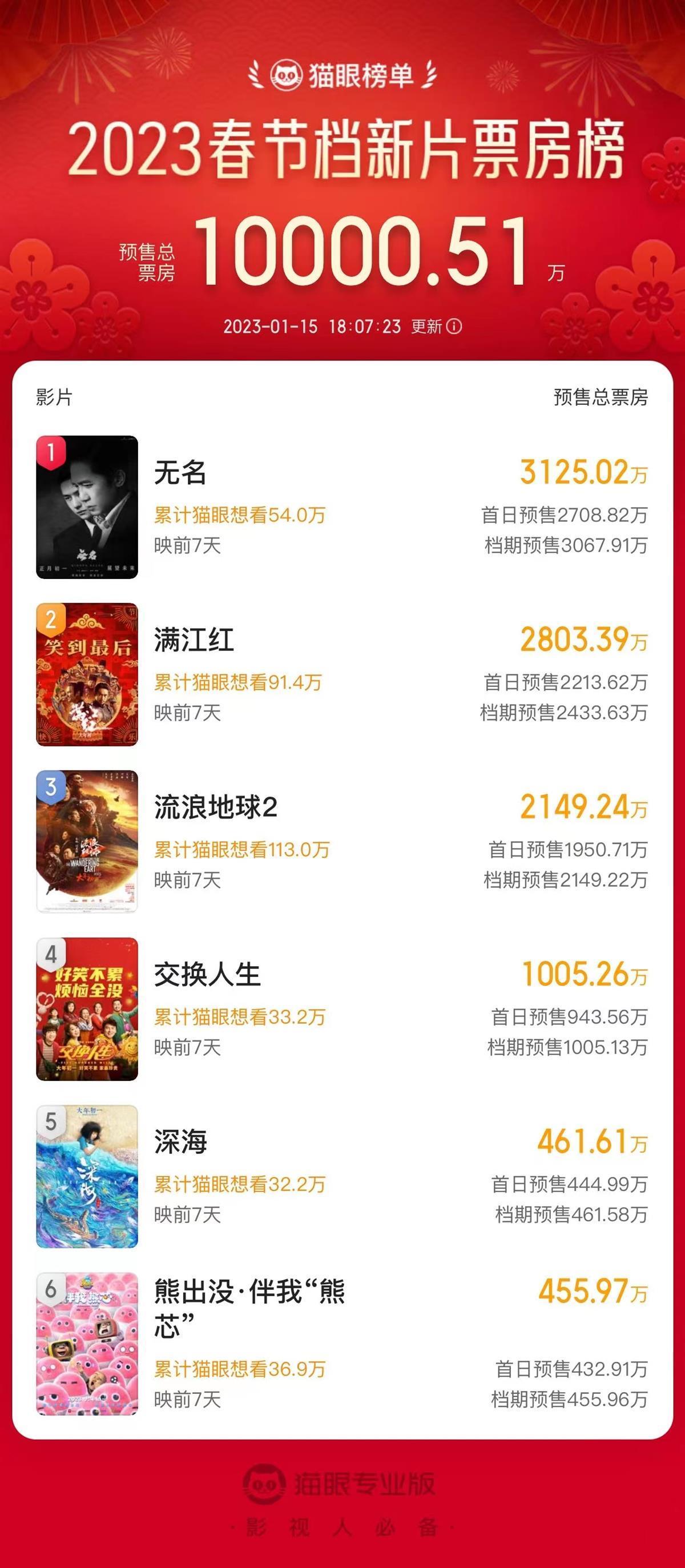 1月14日上午,今年春節檔正式開啟預售,為8天后大年初一的“群雄逐鹿”提前預熱。截至1月15日18時許,6部春節檔新片的預售總票房突破1億元大關,其中,程耳導演的新片,由梁朝偉、王一博主演《無名》以3100萬左右的成績暫時領跑預售票房榜,排在第二、第三位的則分別是張藝謀導演新作《滿江紅》和吳京、劉德華主演的科幻大片《流浪地球2》。