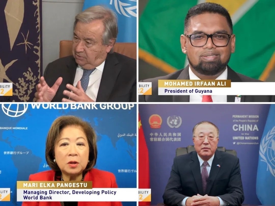 左上聯(lián)合國(guó)秘書(shū)長(zhǎng)古特雷斯 右上圭亞那總統(tǒng)穆罕默德·伊爾法恩·阿里 左下世界銀行常務(wù)副行長(zhǎng)馮慧蘭 右下中國(guó)常駐聯(lián)合國(guó)大使張軍