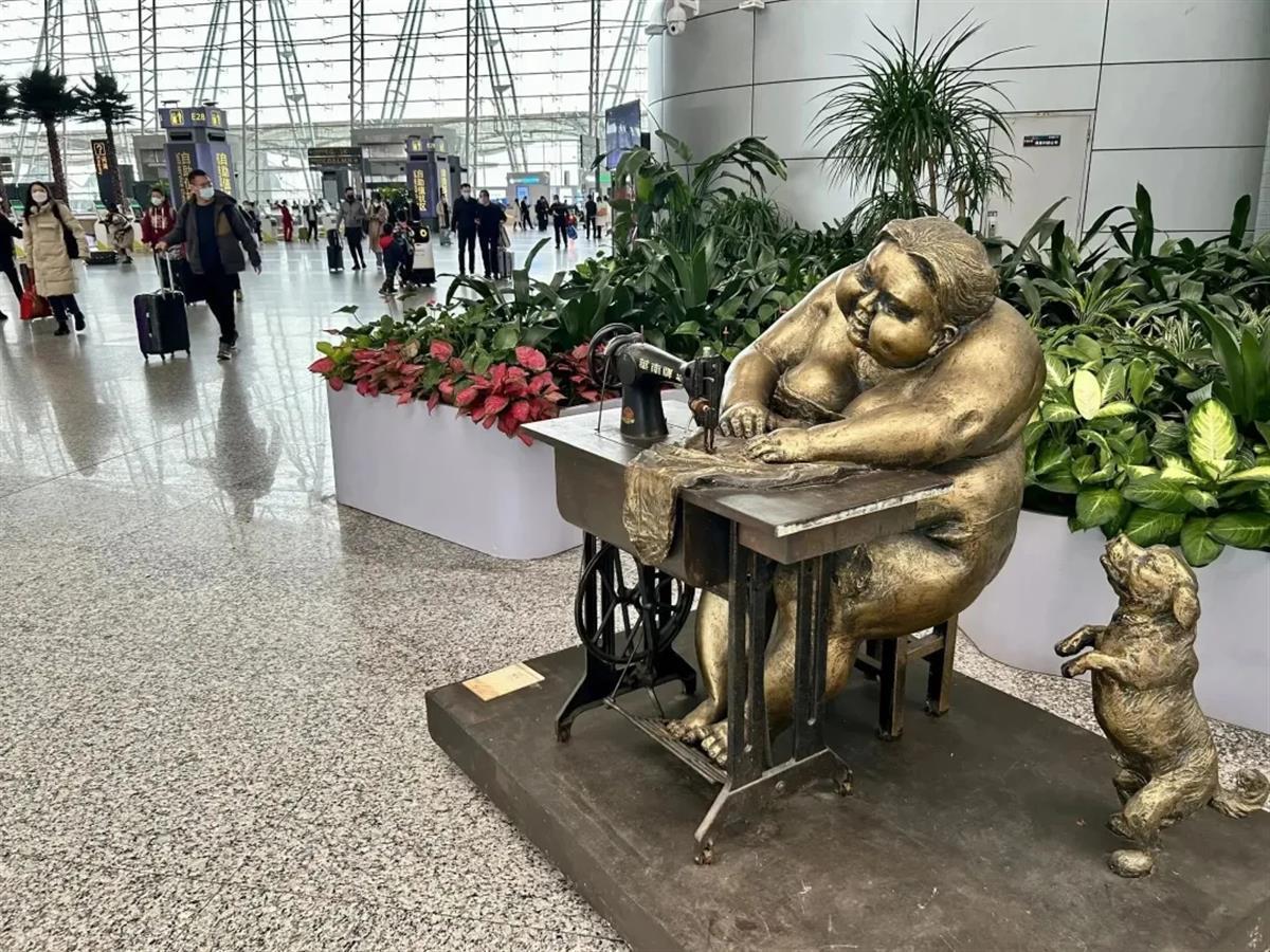 1月17日,廣東一位網(wǎng)友發(fā)視頻吐槽稱,廣州白云機(jī)場(chǎng)大廳內(nèi)有一個(gè)肥胖的女人踩縫紉機(jī)的雕塑,很丑,看不懂這樣的雕塑設(shè)計(jì)想表達(dá)什么意思。
