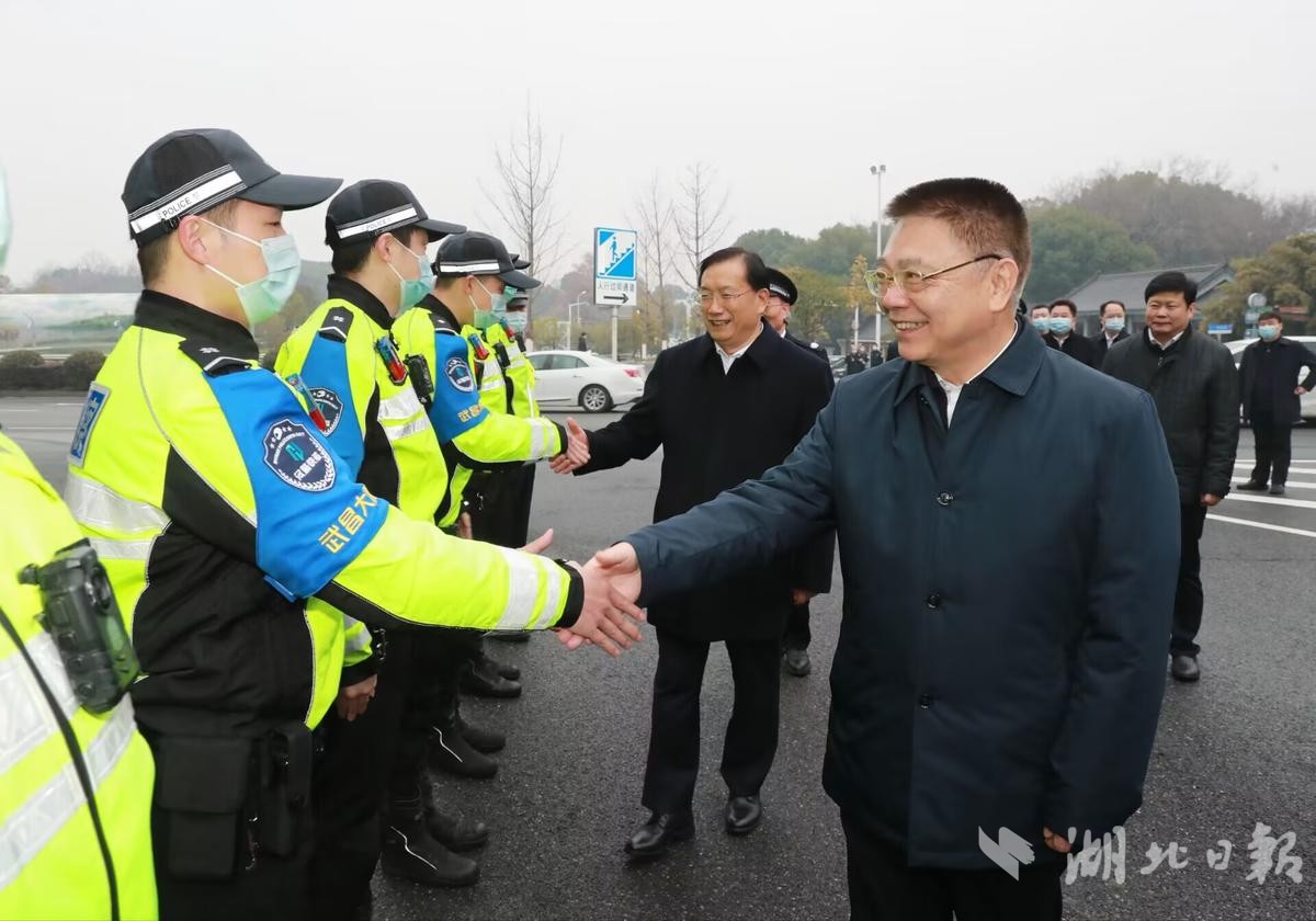 王蒙徽、王忠林來到武昌區交通大隊東湖梨園崗,看望慰問正在執勤的交警,與他們一一握手,并向奮戰在一線的廣大交警致以新春祝福。