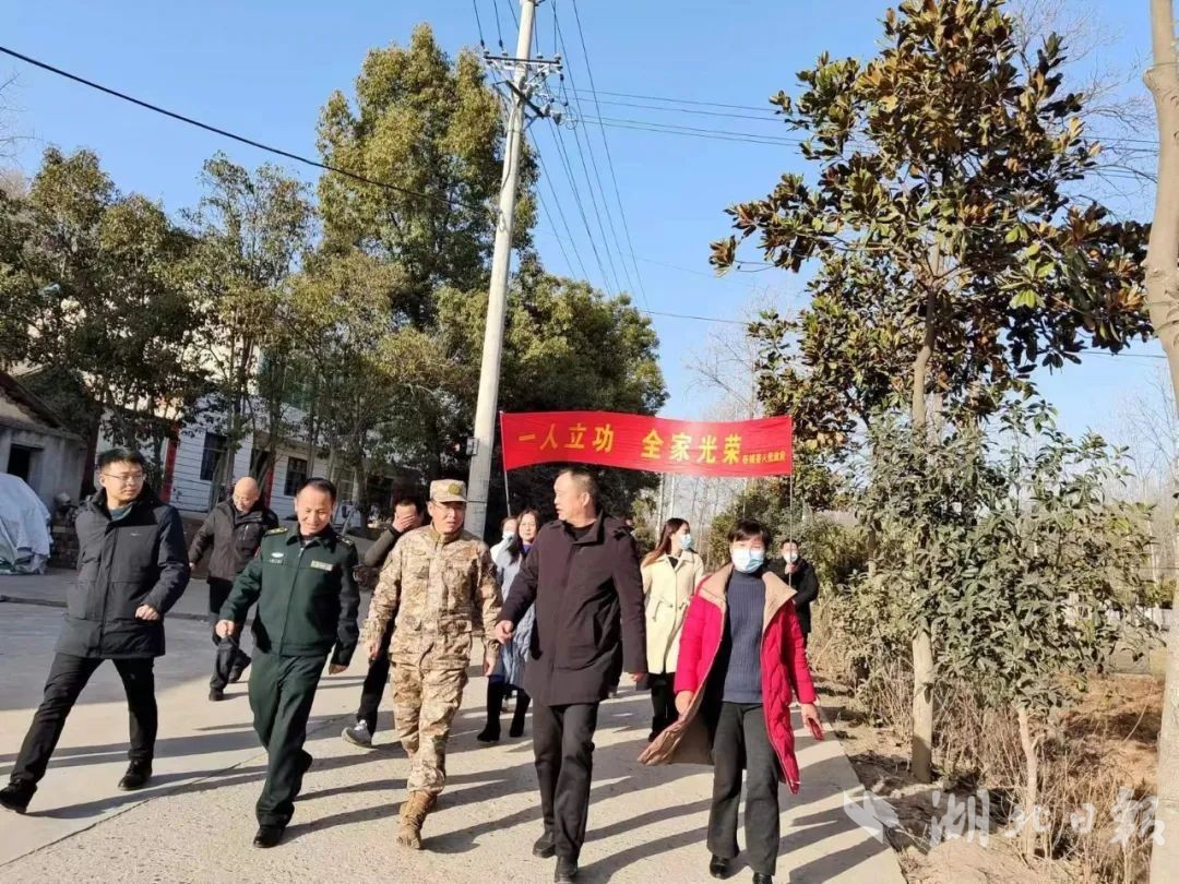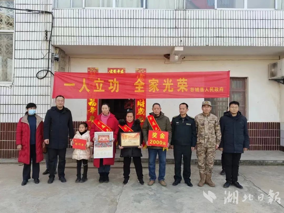 湖北日報客戶端訊(通訊員 姚靜 鄒雷)1月28日下午,谷城縣石花鎮大峪村2組葛秀輝家門前鑼鼓陣陣,熱鬧非凡。火箭軍某部隊聯合縣人武部、縣退役軍人事務局、石花鎮政府工作人員一行,把三等功喜報送到了現役軍人葛秀輝的家中,讓他和家屬共同感受到了這份喜悅和榮光。
