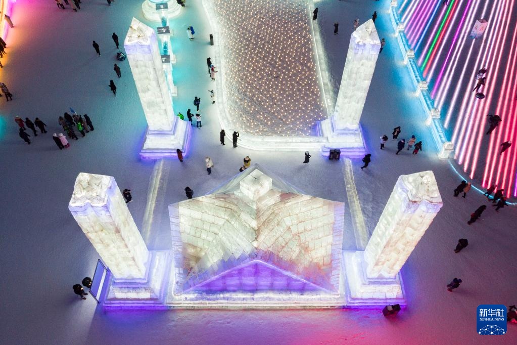 2月1日,游客在哈爾濱冰雪大世界園區(qū)冰雪景觀《勇士廣場》周邊游玩。該冰雪景觀以哈薩克斯坦的潘菲洛夫-28勇士紀(jì)念公園為原型設(shè)計(jì)建造(無人機(jī)照片)。