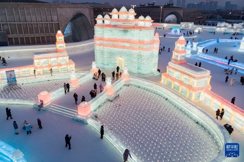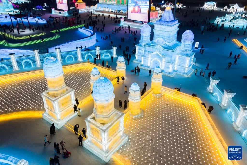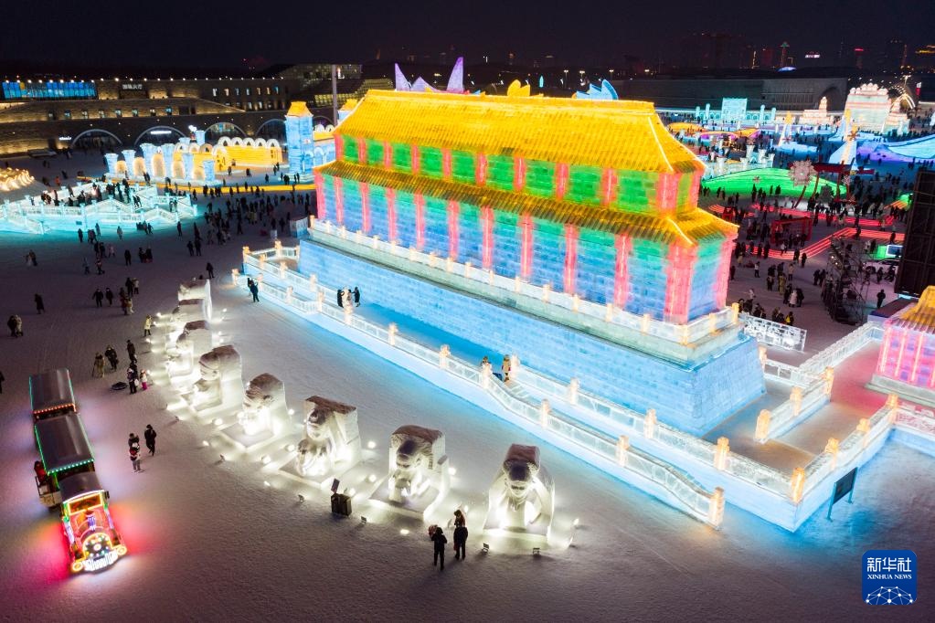 2月1日,游客在哈爾濱冰雪大世界園區(qū)冰雪景觀《夢想大舞臺》周邊游玩。該冰雪景觀以中國的太和殿為原型設(shè)計(jì)建造(無人機(jī)照片)。