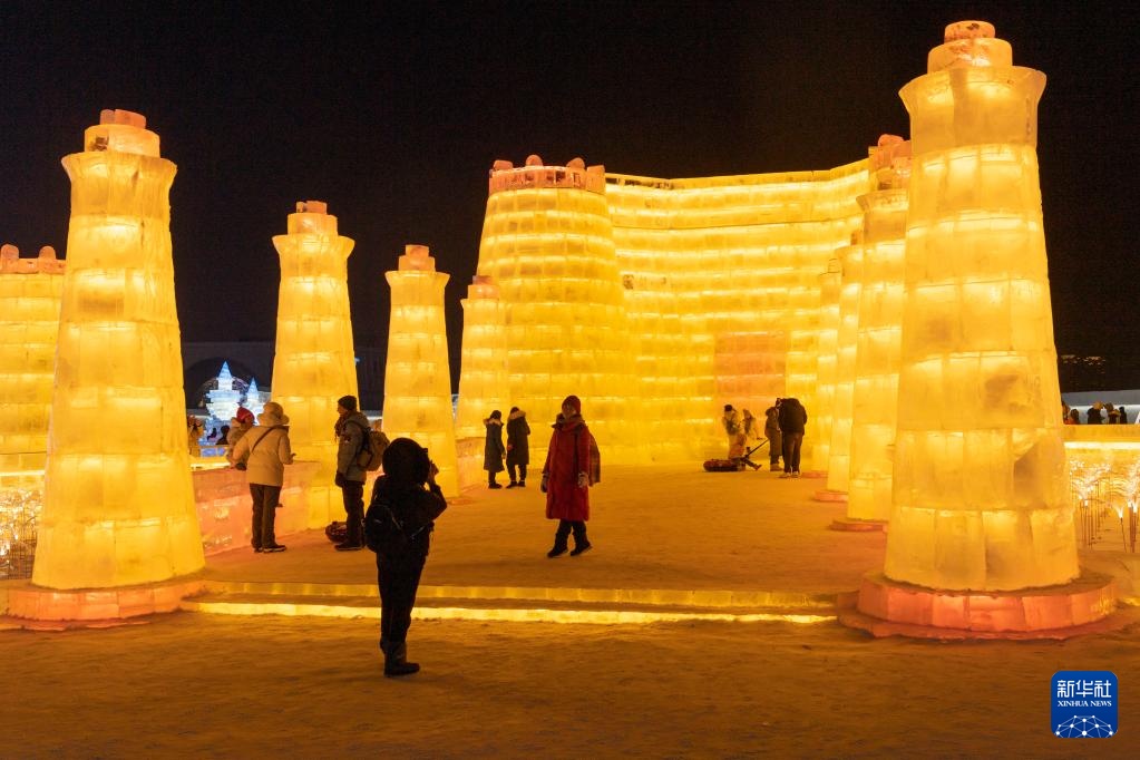 2月1日,游客在哈爾濱冰雪大世界園區(qū)冰雪景觀《自由堡壘》周邊游玩。該冰雪景觀以塔吉克斯坦的苦盞博物館為原型設(shè)計(jì)建造。