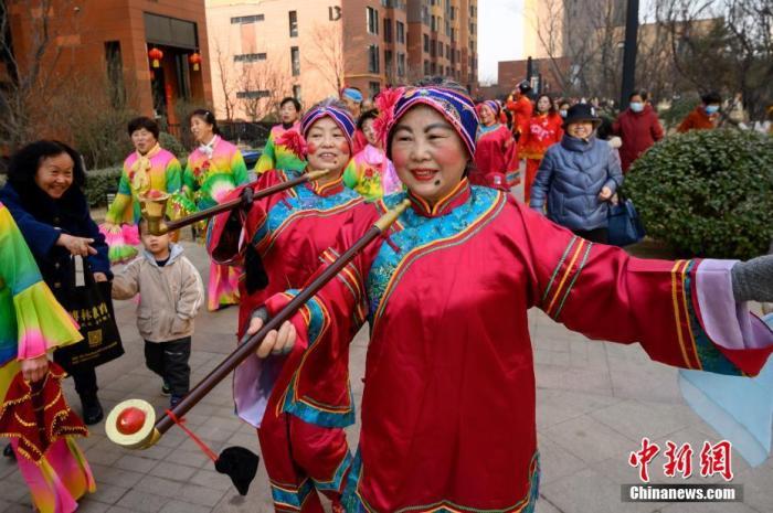 資料圖:山西省太原市,由演員扮演的“媒婆”在社區(qū)表演社火,慶祝元宵節(jié)。 中新社記者 韋亮 攝