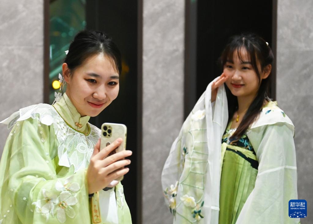 2月4日,漢服愛好者在中國文字博物館里拍照留念。