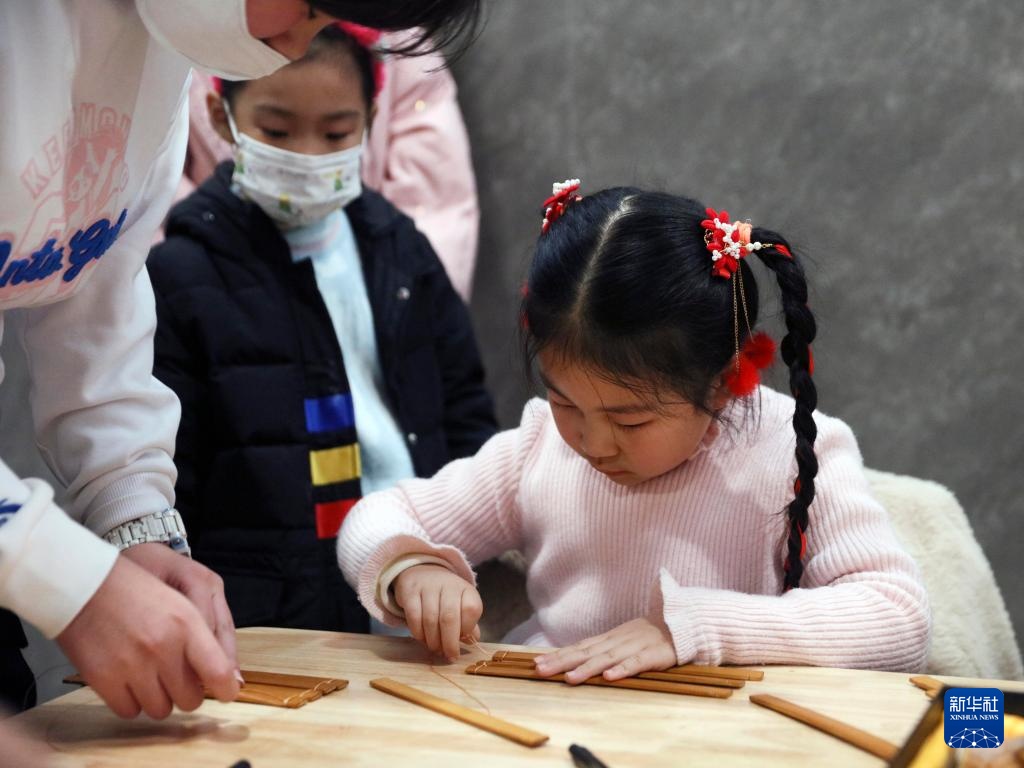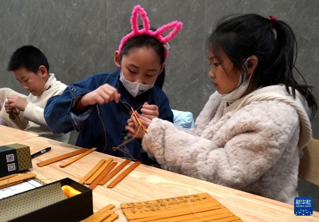 2月4日,小朋友在中國文字博物館體驗竹簡制作。