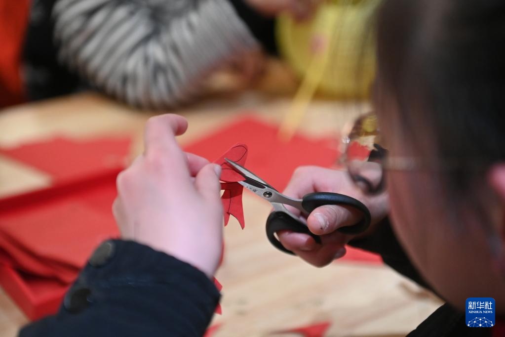 2月4日,小朋友在體驗剪紙。
