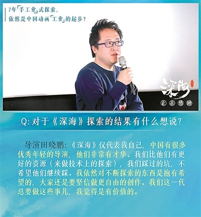 《大圣歸來》豆瓣8.3分,《深海》7.3分,一分之差,讓田曉鵬聽到了不少批評的聲音,對此田曉鵬坦承《深海》是他一次冒險,這是他一次非常個人化的創作,“我愿意承擔這次冒險的代價”。