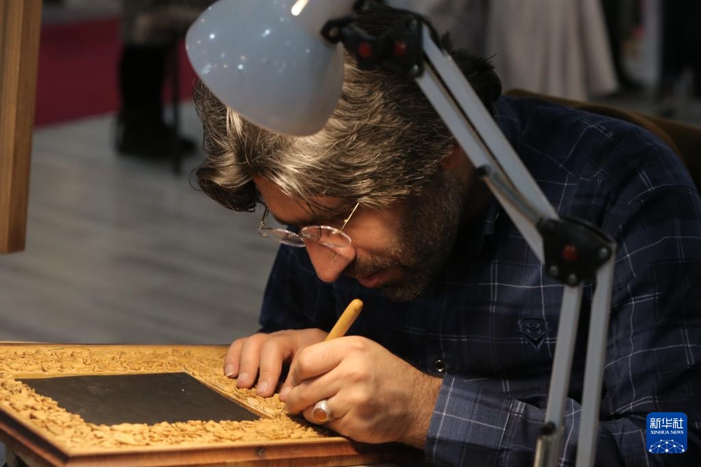 2月7日,參展商在伊朗德黑蘭展示手工藝品制作技藝。