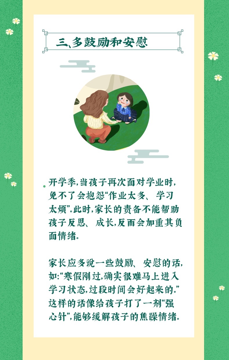 在假期里,孩子通常都是與親近的人相處,這就為孩子提供了一個“社交舒適圈”。開學后,孩子要跳出自己的“舒適圈”,處理學校的人際關系。“我在班里人緣不好怎么辦?我會不會與同學出現矛盾?老師不喜歡我怎么辦?”對這些問題的過度擔心,會使孩子感到焦慮。