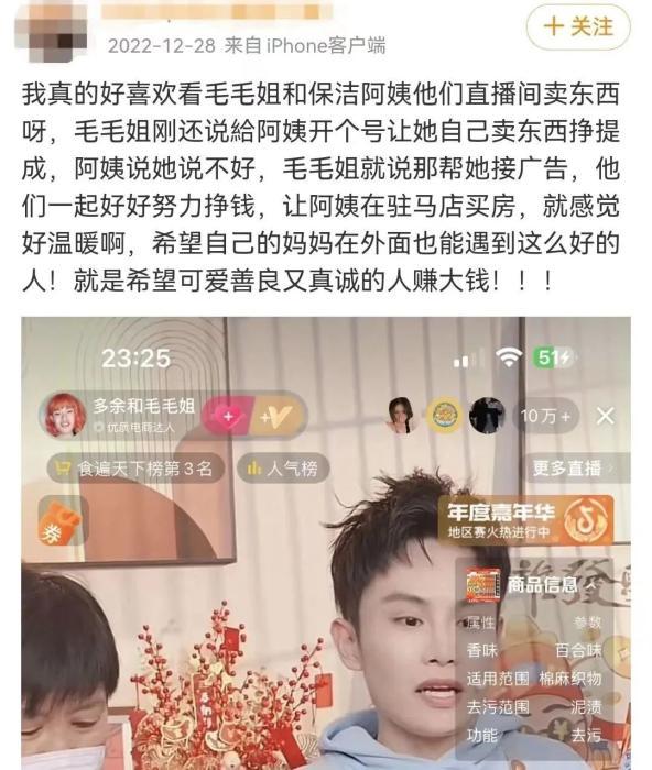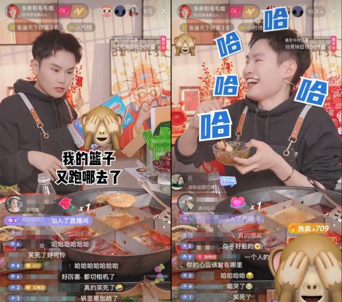 來看這一老一少的人越來越多,網(wǎng)友們說,阿姨才是直播間“一姐”。后來,“毛毛姐”索性讓“一姐”舉著白板,上書“不想吃”三個(gè)大字。二人逐漸有了默契,有時(shí)他算折扣有點(diǎn)混亂,算了好幾次都沒算對,“一姐”就默默地在旁邊按計(jì)算器,算好了遞給他;賣米粉的時(shí)候,“一姐”默默煮粉,筷子攪啊攪,就這么幾分鐘時(shí)間,攪得直播間人數(shù)從5萬漲到十幾萬。“一姐”后來接受采訪時(shí)說,當(dāng)時(shí)她只想把粉煮熟,不過直播間人多了她也高興。
