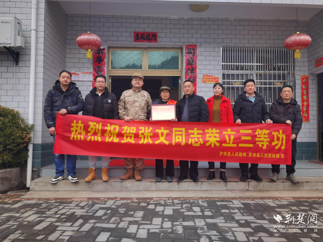 荊楚網(湖北日報網)訊(通訊員程潔 王宏祿)日前,羅田籍現役女軍官、國防科技大學某院系技術上校張文榮立三等功。2月14日,由羅田縣人武部、縣退役軍人事務局、九資河鎮政府組成的送喜報小分隊來到張文的家鄉河西畈村,為其家庭送去立功喜報。