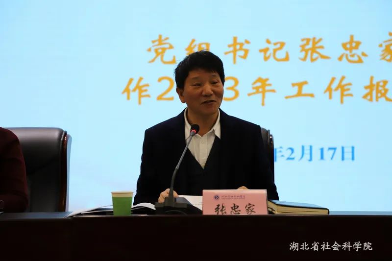2023年2月17日,湖北省社會科學院召開2023年度工作會議。黨組書記、副院長張忠家作工作報告,黨組副書記、院長劉光遠主持會議。黨組成員、副院長袁北星、鄧為、魏登才出席會議,全院干部職工參加會議。