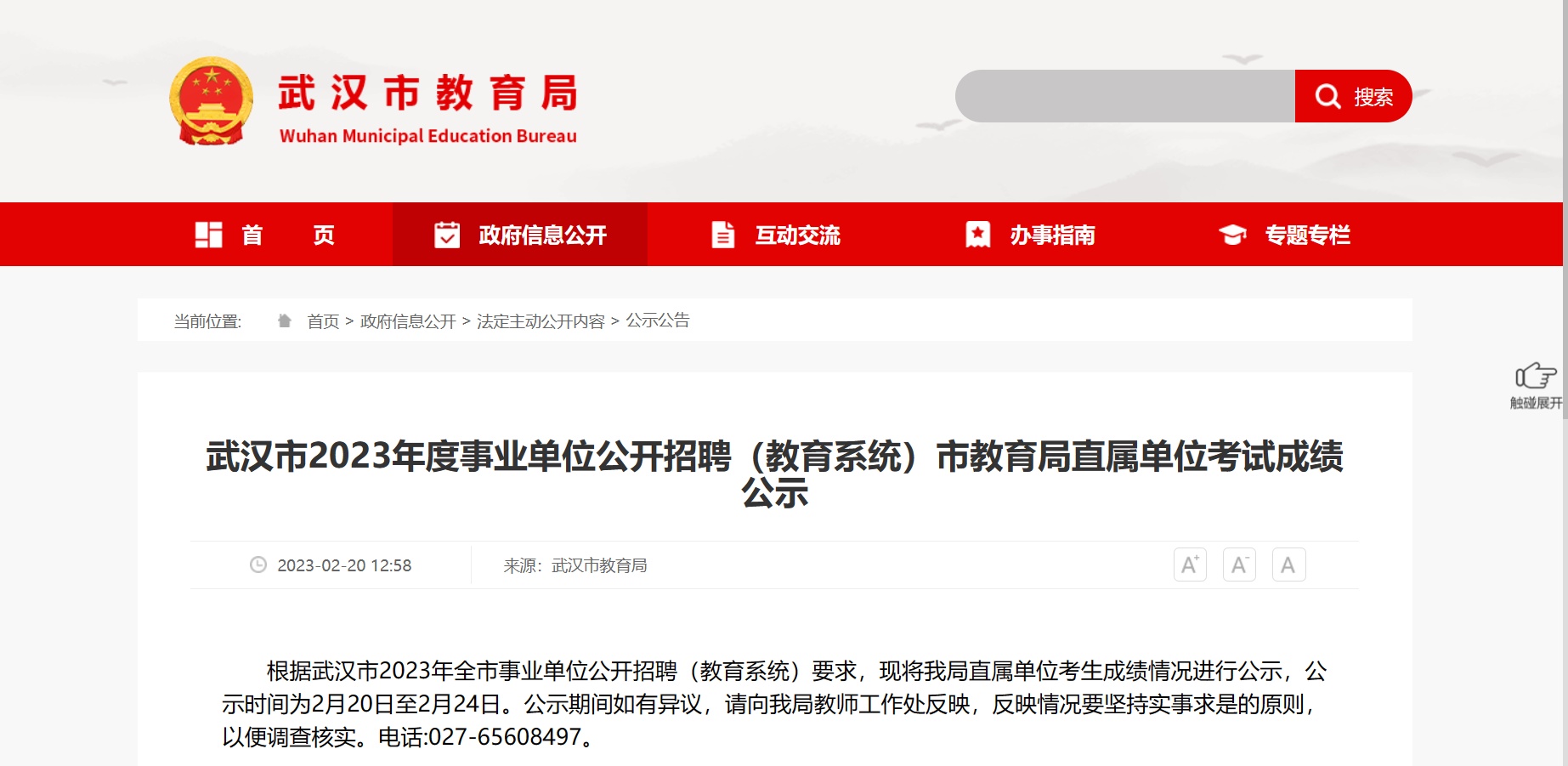 2月20日,武漢市教育局官網發布2023年度事業單位公開招聘(教育系統)市教育局直屬單位考試成績公示。