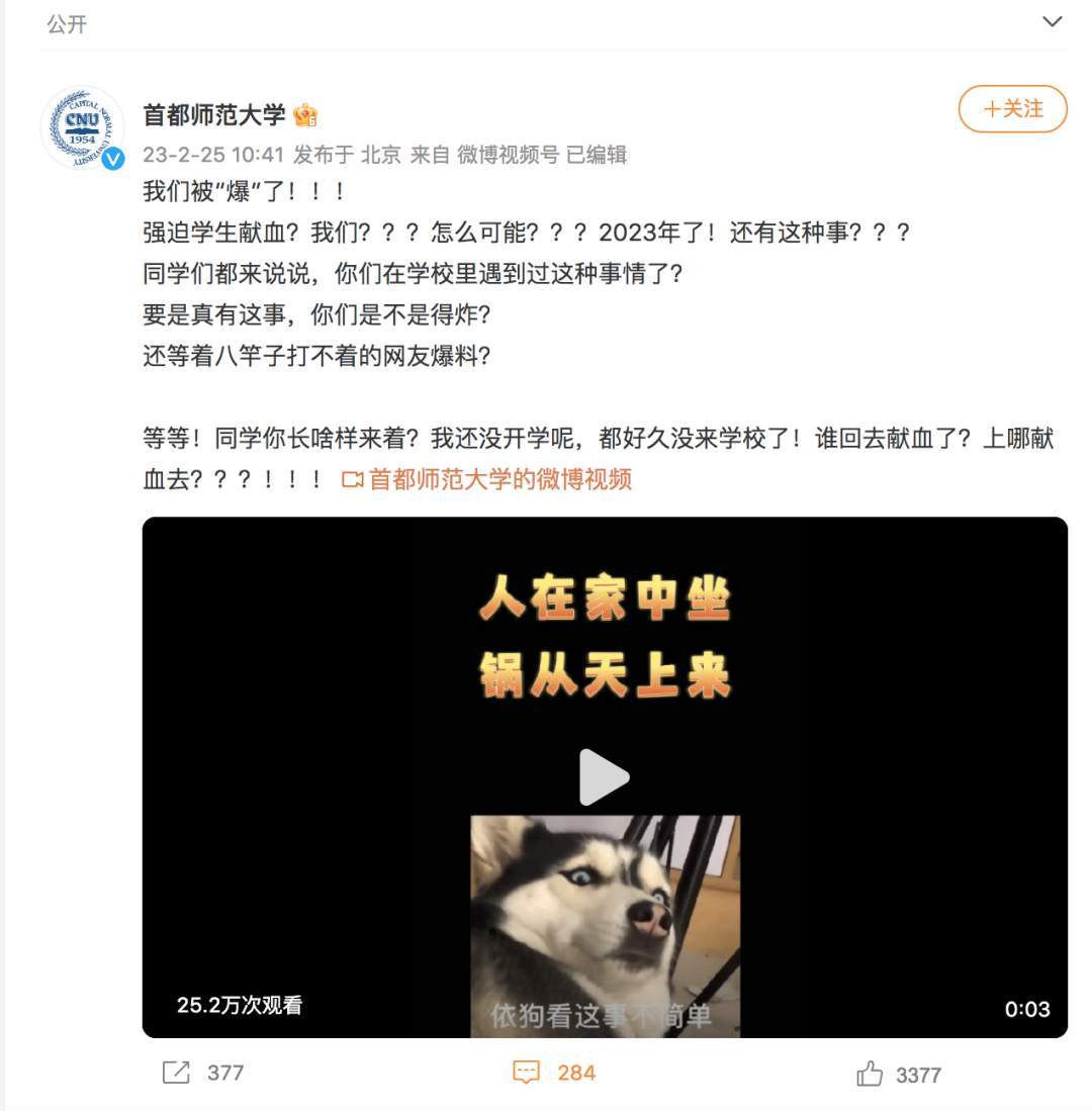 近日,有網傳消息稱首都師范大學強迫學生獻血。2月25日,首都師范大學通過官方微博辟謠,博文附的視頻中寫著“人在家中坐,鍋從天上來”。全文如下↓