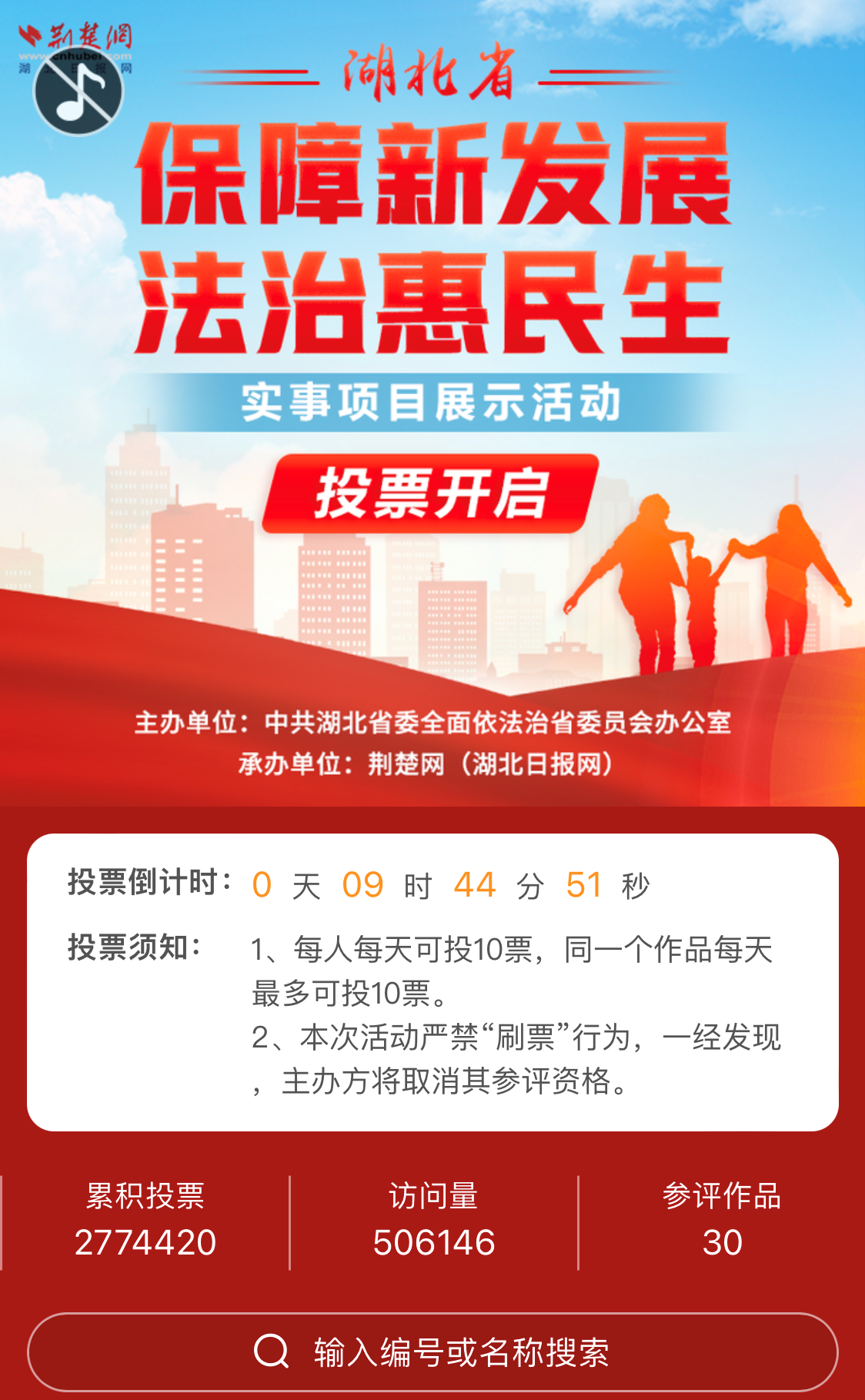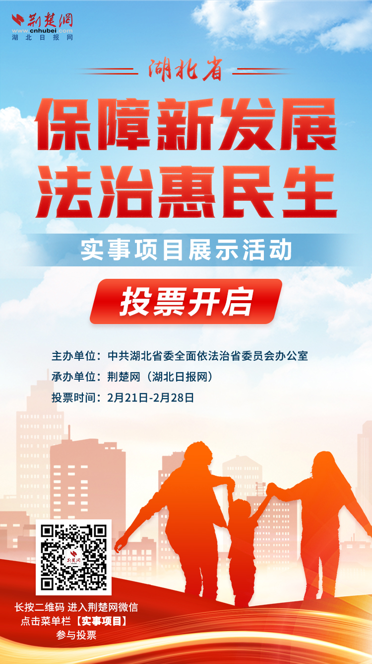 荊楚網(湖北日報網)訊(記者肖慧婷 通訊員王相生)由中共湖北省委全面依法治省委員會辦公室主辦,荊楚網(湖北日報網)承辦的“保障新發展 法治惠民生”實事項目集中展示活動投票時間已經進入倒計時,截至2月28日14時,網絡投票累計票數超270萬,總訪問量約50萬人次。