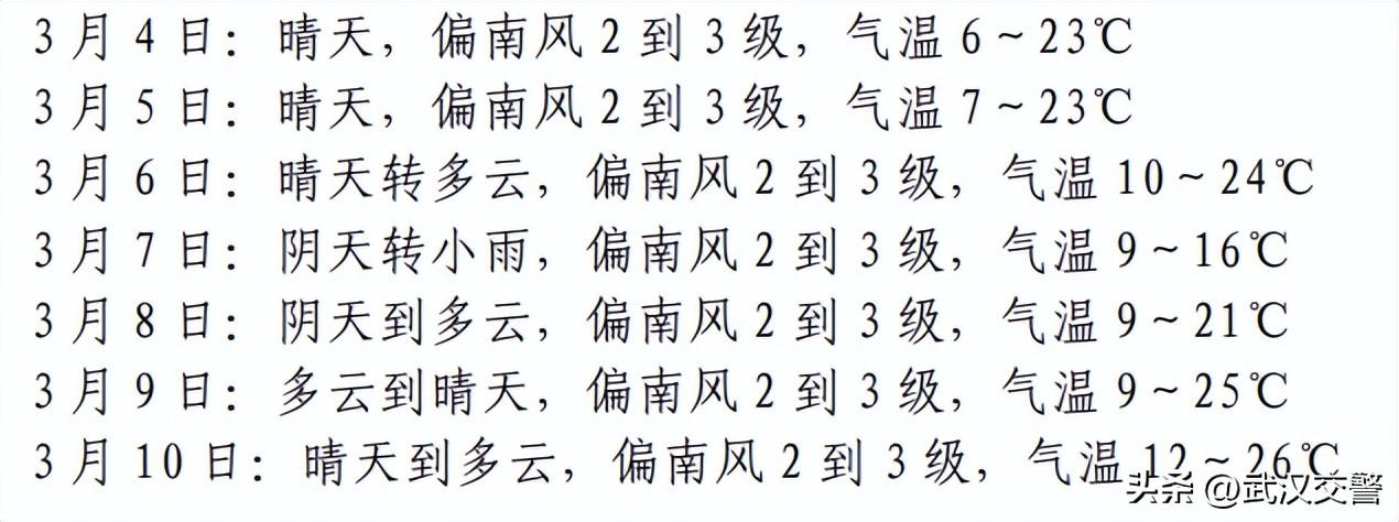 根據(jù)武漢市氣象臺(tái)預(yù)報(bào),本周末以晴天為主,氣溫逐步升高,預(yù)計(jì)周末兩天出門踏春、賞花人群將會(huì)增多,景區(qū)、公園周邊道路交通壓力較大。武漢交警建議廣大市民盡量選擇公共交通出行,駕車出游請(qǐng)?zhí)崆耙?guī)劃好行程和停車場(chǎng)所。