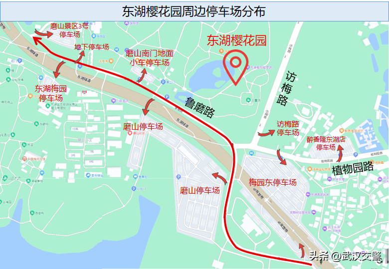 自駕:車輛可停靠在磨山景區(qū)停車場(chǎng),共有3500個(gè)車位;也可以駕車前往「白馬洲頭」驛站停車場(chǎng),然后乘坐觀光車直達(dá)東湖櫻花園。
